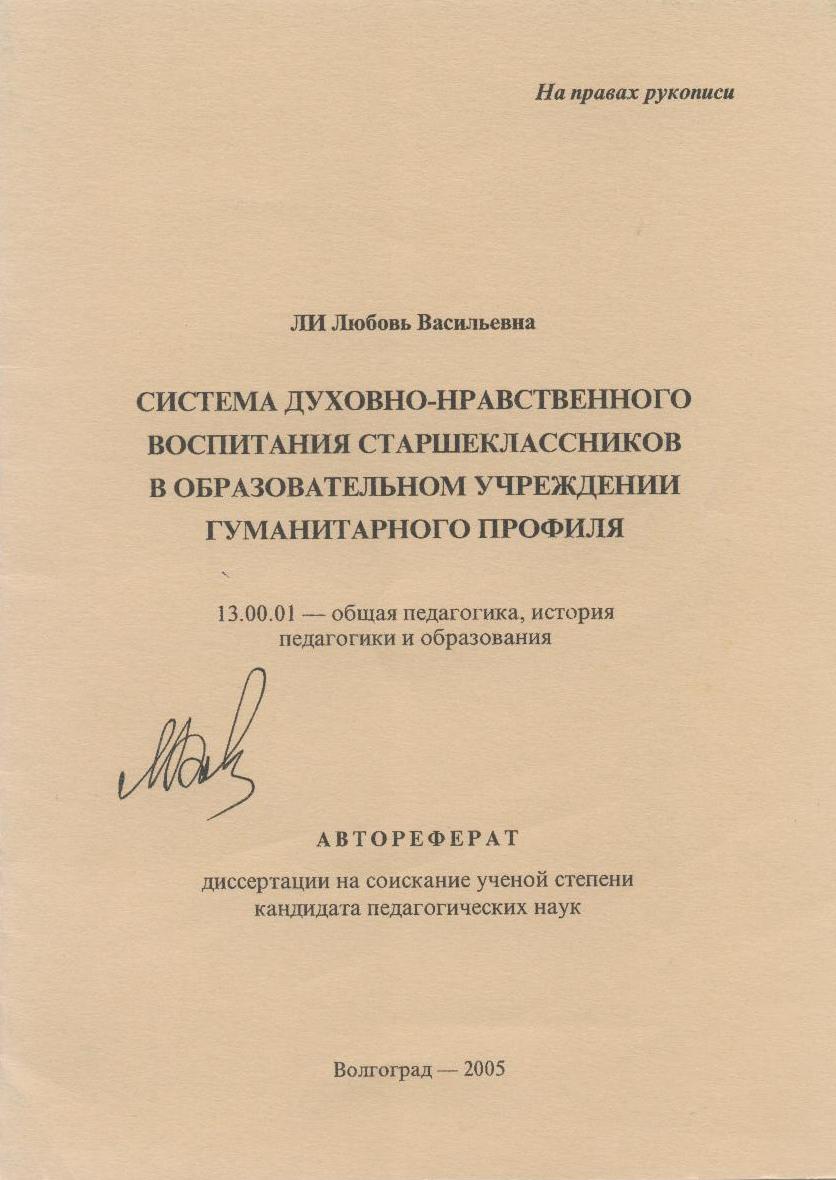 2) Ли, Л.В. Система духовно-нравственного воспитания старшеклассников в образовательном учреждении гуманитарного профиля.Монография. -М., Красный пролетарий, 2006.-80 с.